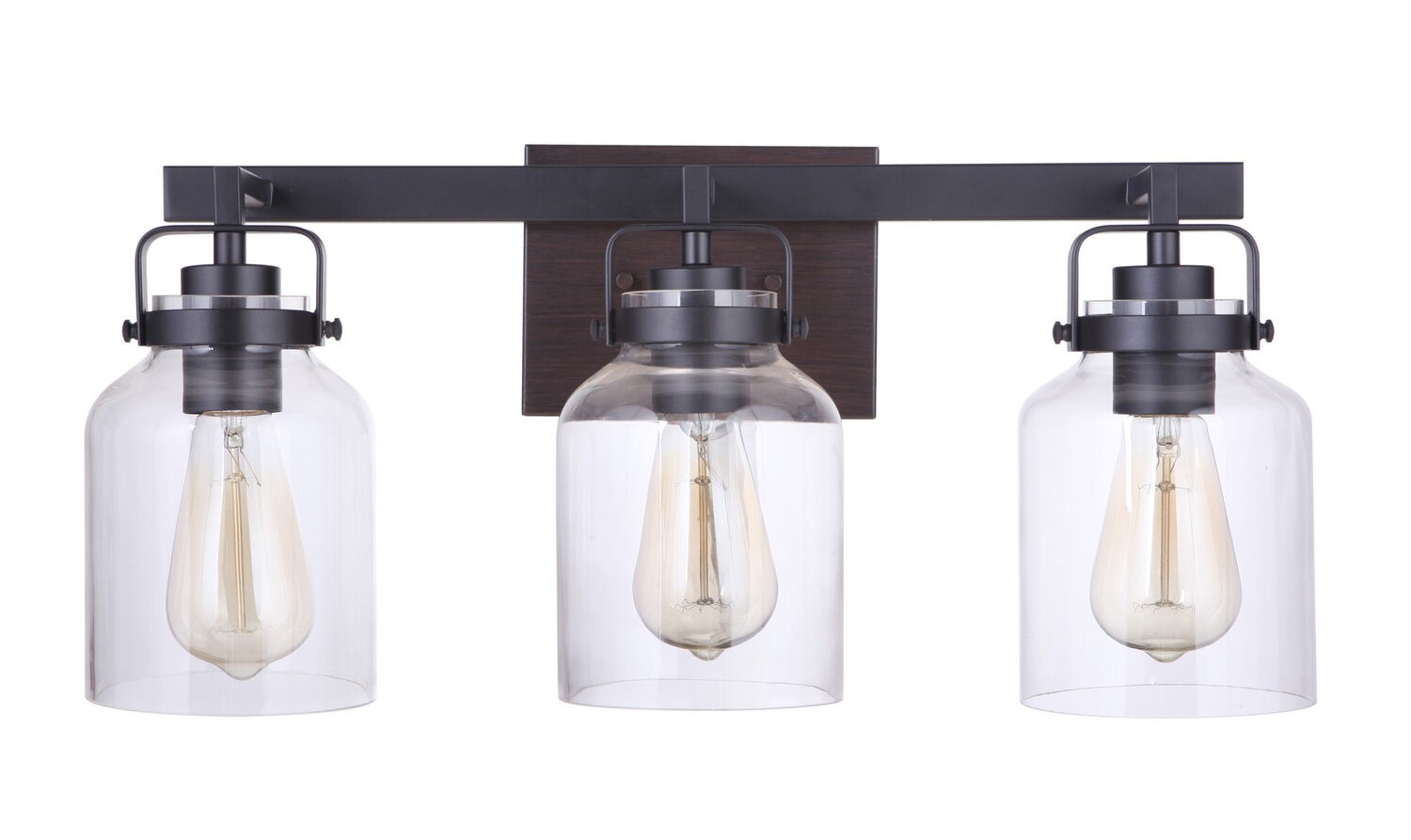 Clean lines, clear glass with a subtle nod to industrial make the Foxwood an ideal choice equally at home in a transitional or traditional setting. The flat black/dark teak finished vanities feature dark teak backplates while the hanging fixtures feature dark teak faux wood frames.