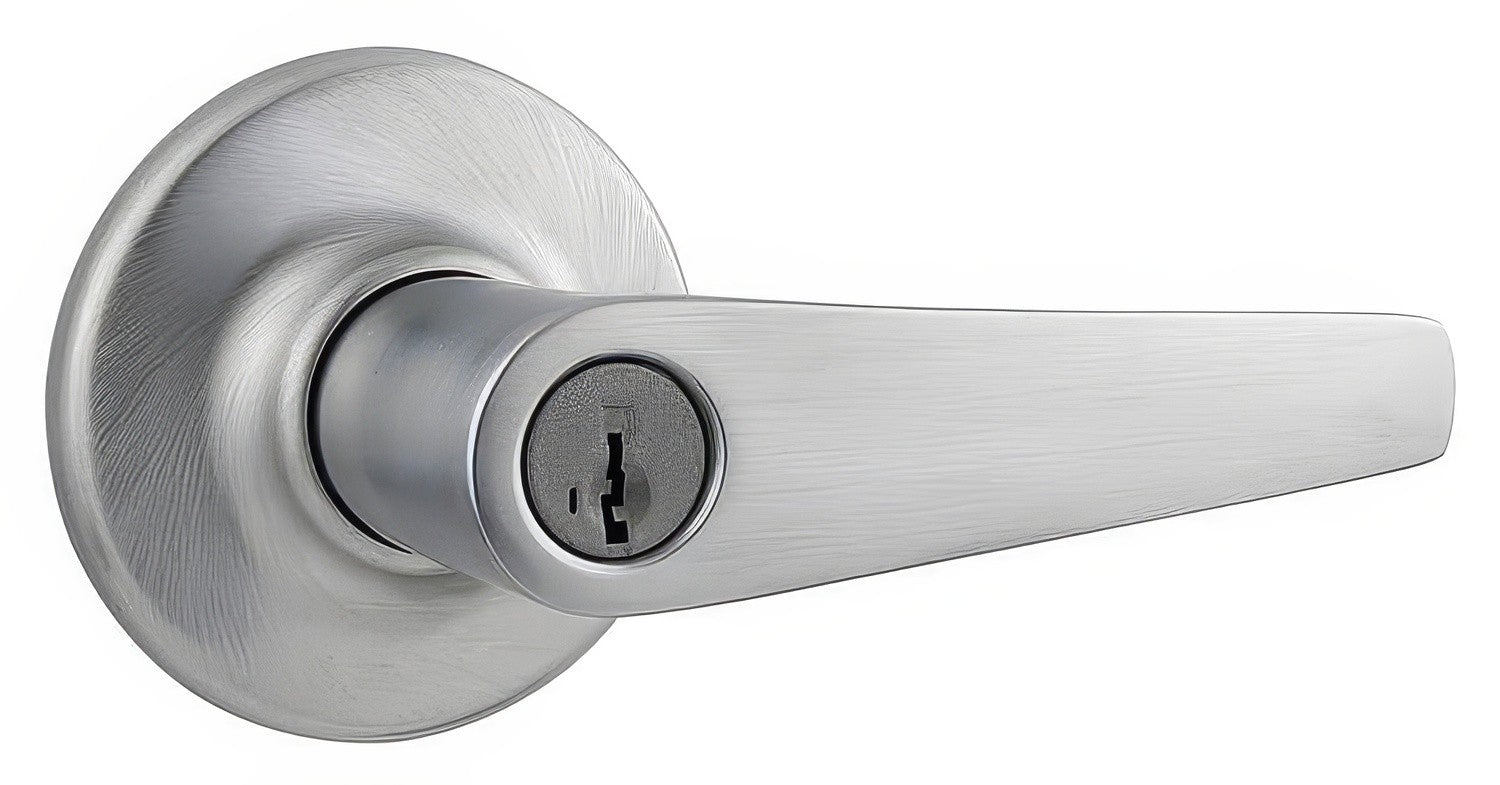 A Keyed Entry door lever is keyed on the exterior and thumb-turn on the interior. A Keyed Entry lever is usually used for a front door, however sometimes they are used in offices.