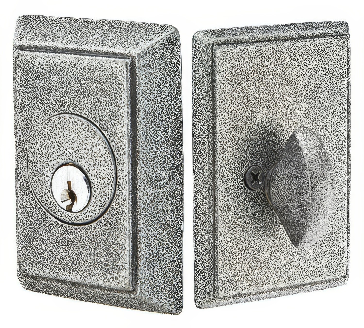 From the blacksmith's anvil, Emtek's Wrought Steel deadbolts add beauty and character to any home. Wrought Steel handles are hot forged, distressed and relieved to achieve an appearance of graceful wear. Make a dramatic decorating statement with these handcrafted designs. The Wrought Steel Collection's knob / lever handles are supported by springs mounted behind the rosettes and sideplates, which return the handles back to the rest position and prevent lever sag. The latches are heavy-duty die cast construction, with strong internal springs, solid brass nose bolts, and sintered metal cams. A plastic bushing located in the joint between the handle and the rosette ensures a friction-free wear surface, preventing metal from bearing on metal and providing smooth, long-lasting operation. Handles are positively connected to rosettes with a permanent clip. Each has a set screw which eliminates "handle wobble" when tightened. Emtek's threaded tubes are machined brass to ensure good threads and prevent corrosion.