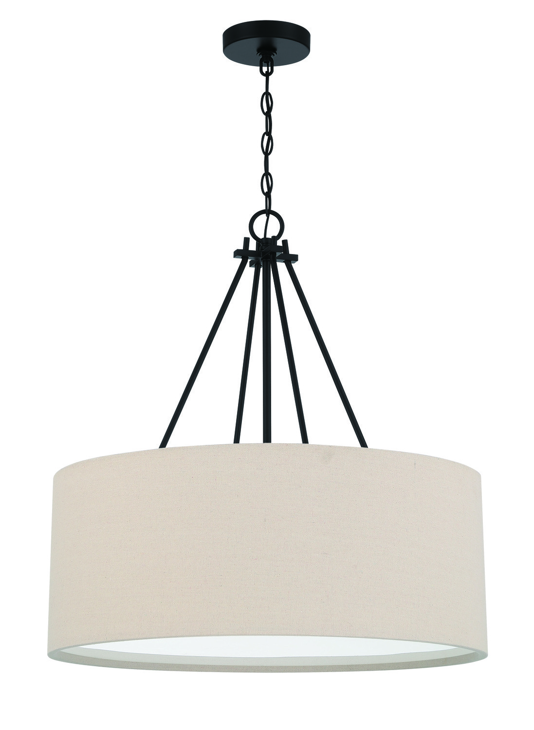 The Duke pendant collection from Craftmade welcomes you with the curves of the crisp linen hardback drum shade complementing the angular metal frame suspended from up to 6' of chain. The three light pendant available in 18" or 24" with white frost acrylic diffuser delivers warm illumination without the bright glare of exposed bulbs.