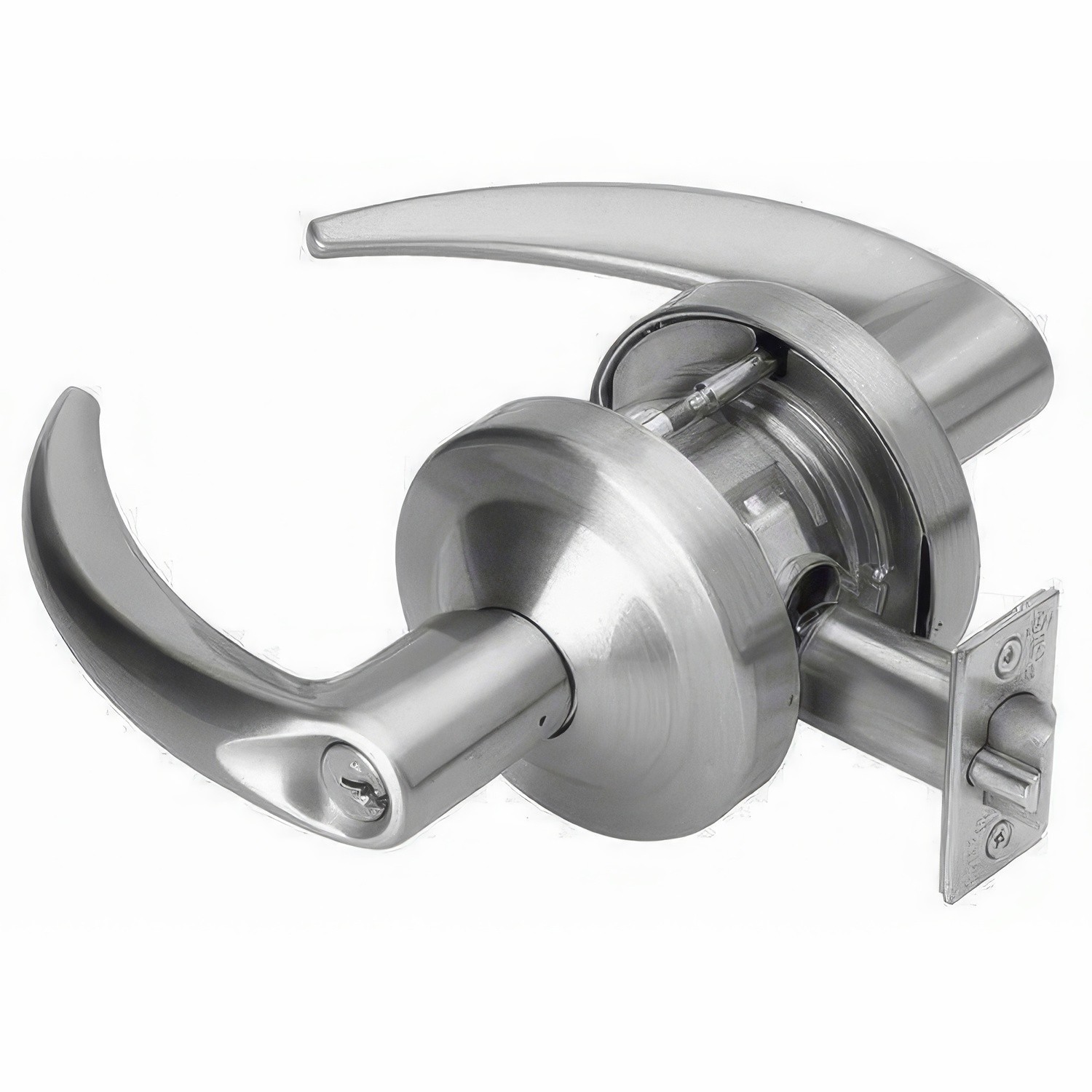 A Keyed Entry door lever is keyed on the exterior and thumb-turn on the interior. A Keyed Entry lever is usually used for a front door, however sometimes they are used in offices.