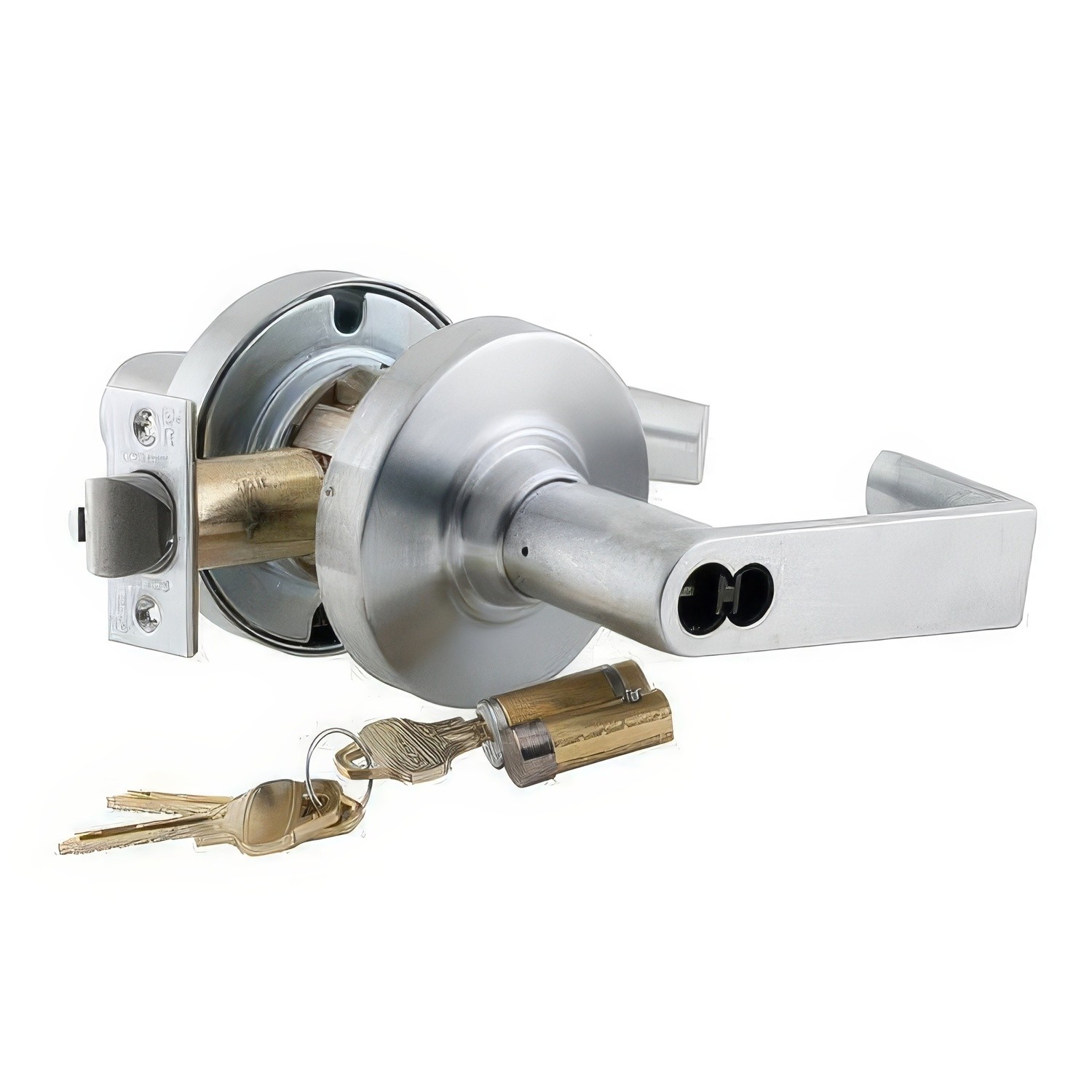 A Keyed Entry door lever is keyed on the exterior and thumb-turn on the interior. A Keyed Entry lever is usually used for a front door, however sometimes they are used in offices.