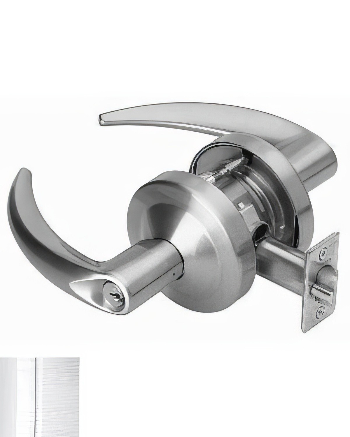 A Keyed Entry door lever is keyed on the exterior and thumb-turn on the interior. A Keyed Entry lever is usually used for a front door, however sometimes they are used in offices.